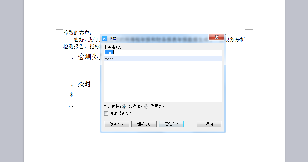 如上图,需要替换的字符串地方“$1”为“1231”,在指定位置插入书签,并命名“test” ,插入的图片如下