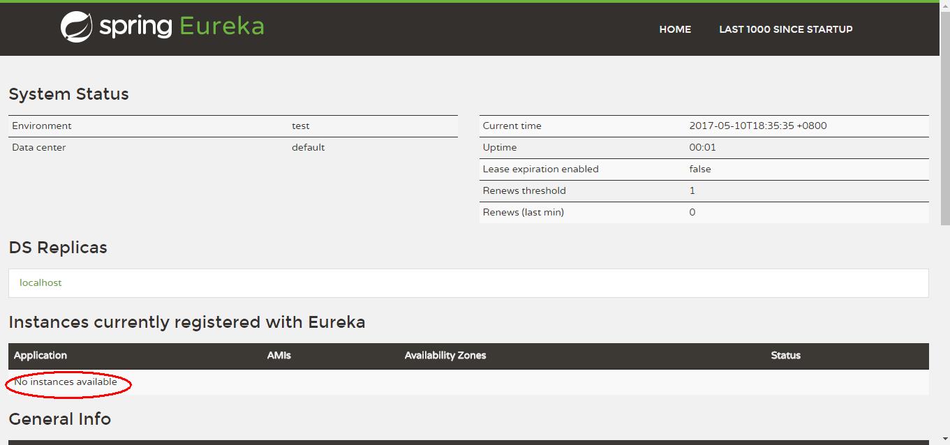 eureka.client.register-with-eureka :表示是否将自己注册到Eureka Server,默认为true。eureka.client.fetch-registry :表示是否从Eureka Server获取注册信息,默认为true。eureka.client.serviceUrl.defaultZone :设置与Eureka Server交互的地址,查询服务和注册服务都需要依赖这个地址。默认是http://localhost:8761/eureka ;多个地址可使用 , 分隔。启动工程后,访问:http://localhost:8000/,可以看到下面的页面,其中还没有发现任何服务