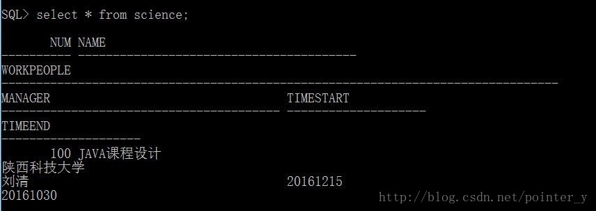 StringBuffer sql=new StringBuffer("insert into science values("+scienceProject.GetNum()+",'"+scienceProject.GetName()+"','"+scienceProject.GetPeople()+"','"+scienceProject.GetLeader()+"','"+scienceProject.GetTimeStart()+"','"+scienceProject.GetTimeFinish()+"')");