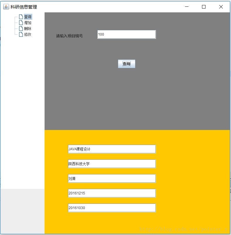 我们管理的属性有:项目编号,项目名称,参与人员,负责人,项目开始时间,结束时间。科研项目系统主要有四个功能,对科研项目的增加、删除、修改、查询。以及为增加系统安全性所设计的登陆模式。