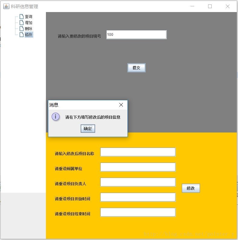 JOptionPane.showMessageDialog(null, "请在下方填写修改后的项目信息");