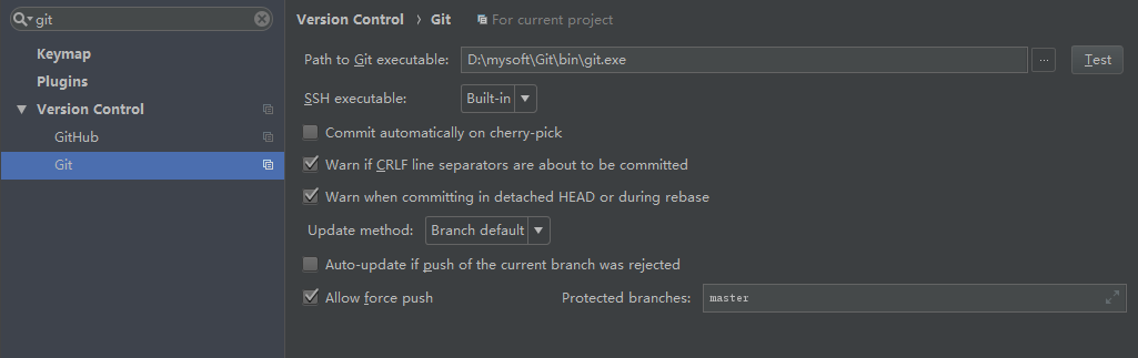 ,也可以通过快捷键Ctrl + Alt + S),搜索git,界面如下: