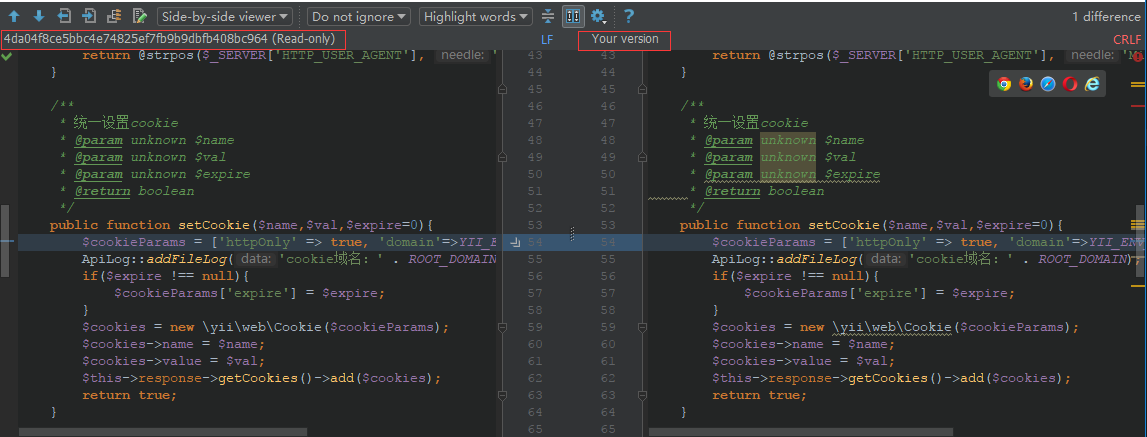 3.Compare with Branch…:与远程分支比较。我们提交前可以通过此功能比较下我们工作目录中代码和远程分支代码的异同。
