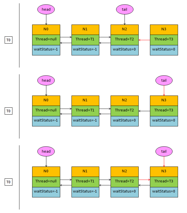 注意,入队操作使用一个死循环,只有成功将结点添加到同步队列尾部才会返回,返回结果是同步队列原先的尾结点。下图演示了整个操作过程。