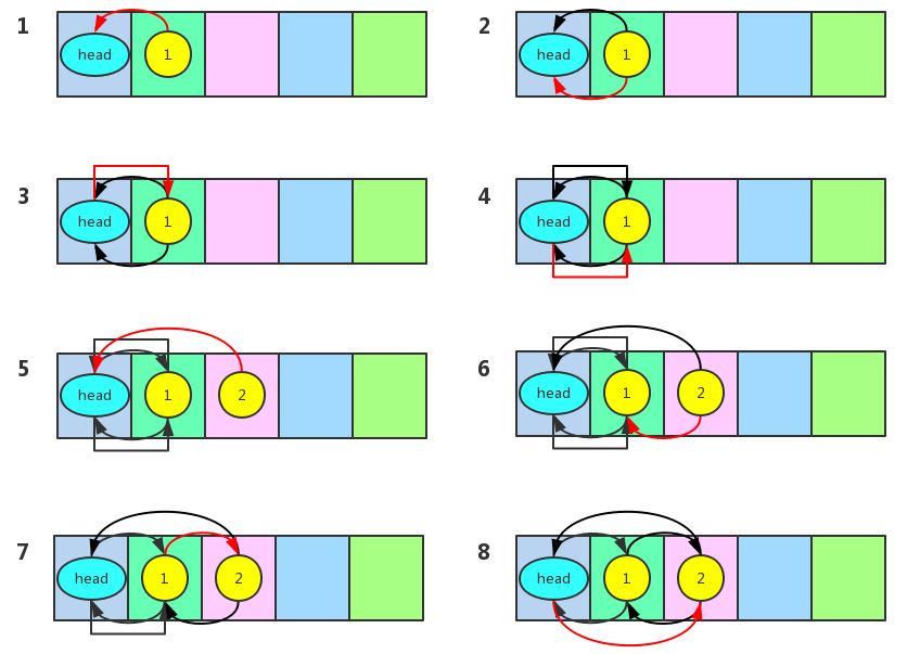 LinkedHashMap重写了它的父类HashMap的addEntry和createEntry方法。当要插入一个键值对的时候,首先会调用它的父类HashMap的put方法。在put方法中会去检查一下哈希表中是不是存在了对应的key,如果存在了就直接替换它的value就行了,如果不存在就调用addEntry方法去新建一个Entry。注意,这时候就调用到了LinkedHashMap自己的addEntry方法。我们看到上面的代码,这个addEntry方法除了回调父类的addEntry方法之外还会调用removeEldestEntry去移除最老的元素,这步操作主要是为了实现LRU算法,下面会讲到。我们看到LinkedHashMap还重写了createEntry方法,当要新建一个Entry的时候最终会调用这个方法,createEntry方法在每次将Entry放入到哈希表之后,就会调用addBefore方法将当前结点插入到双向链表的尾部。这样双向链表就记录了每次插入的结点的顺序,获取元素的时候只要遍历这个双向链表就行了,下图演示了每次调用addBefore的操作。由于是双向链表,所以将当前结点插入到头结点之前其实就是将当前结点插入到双向链表的尾部。