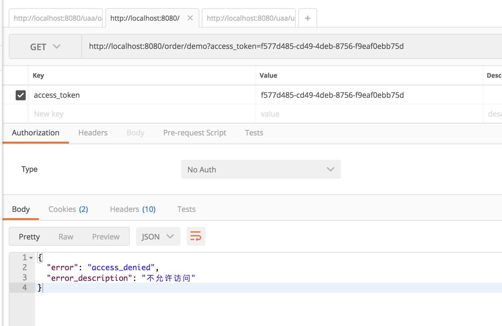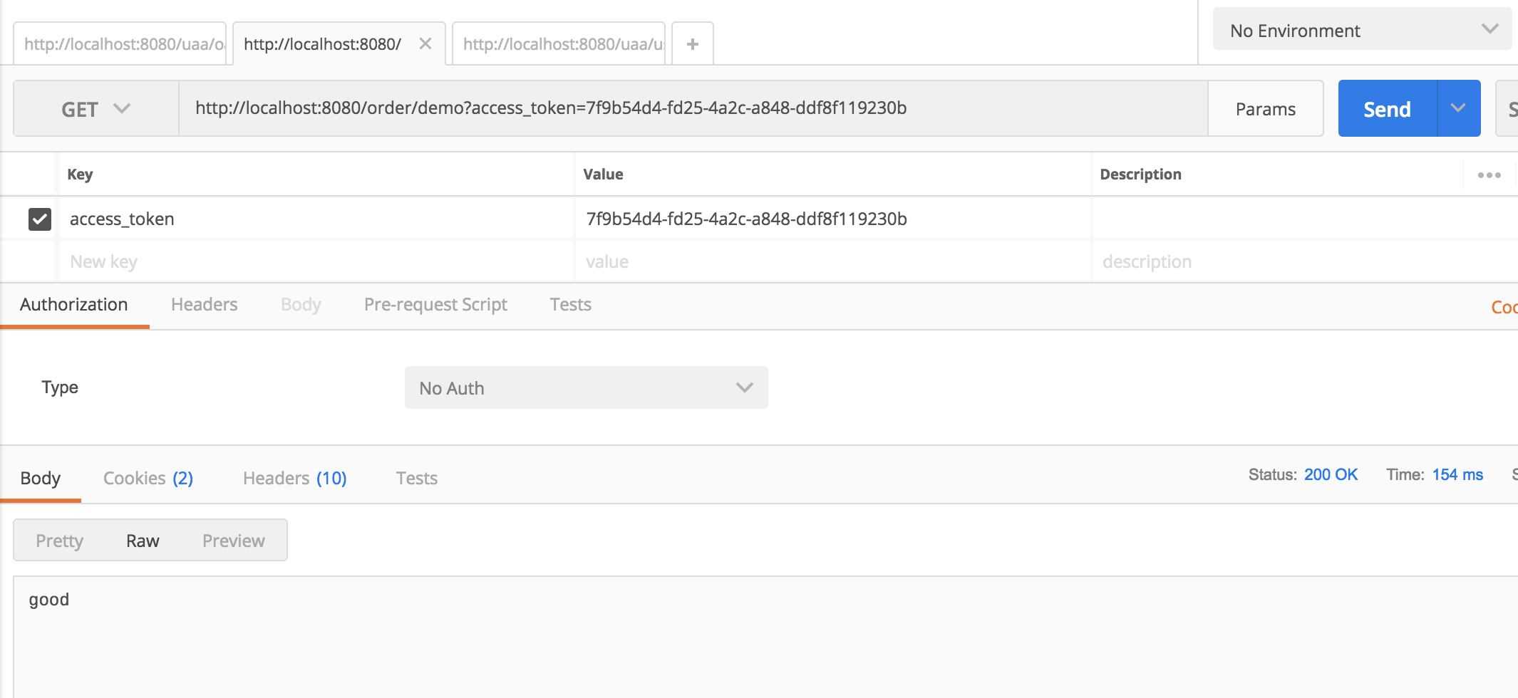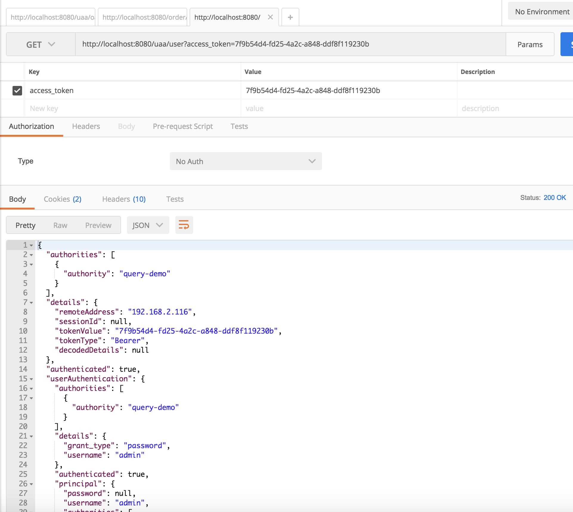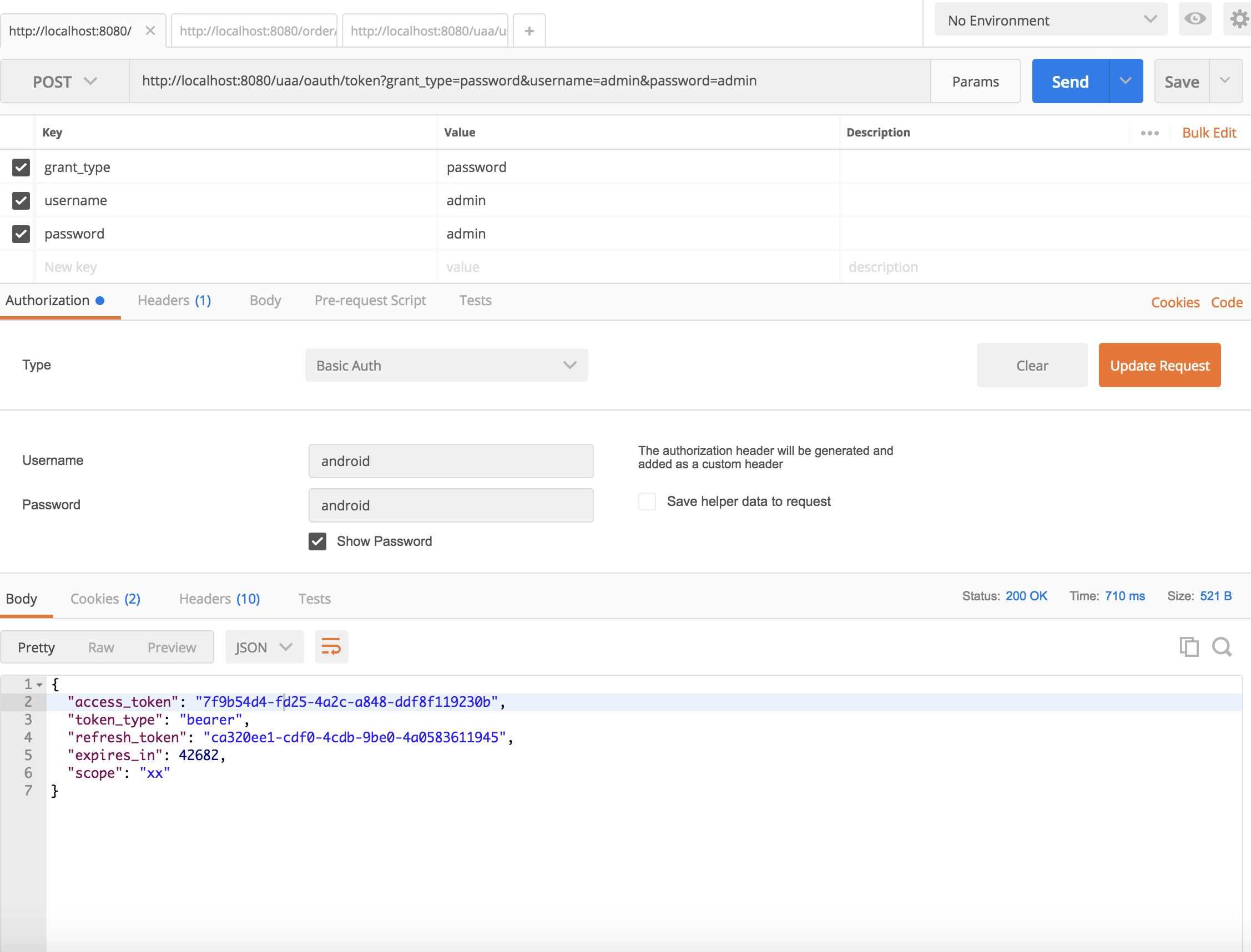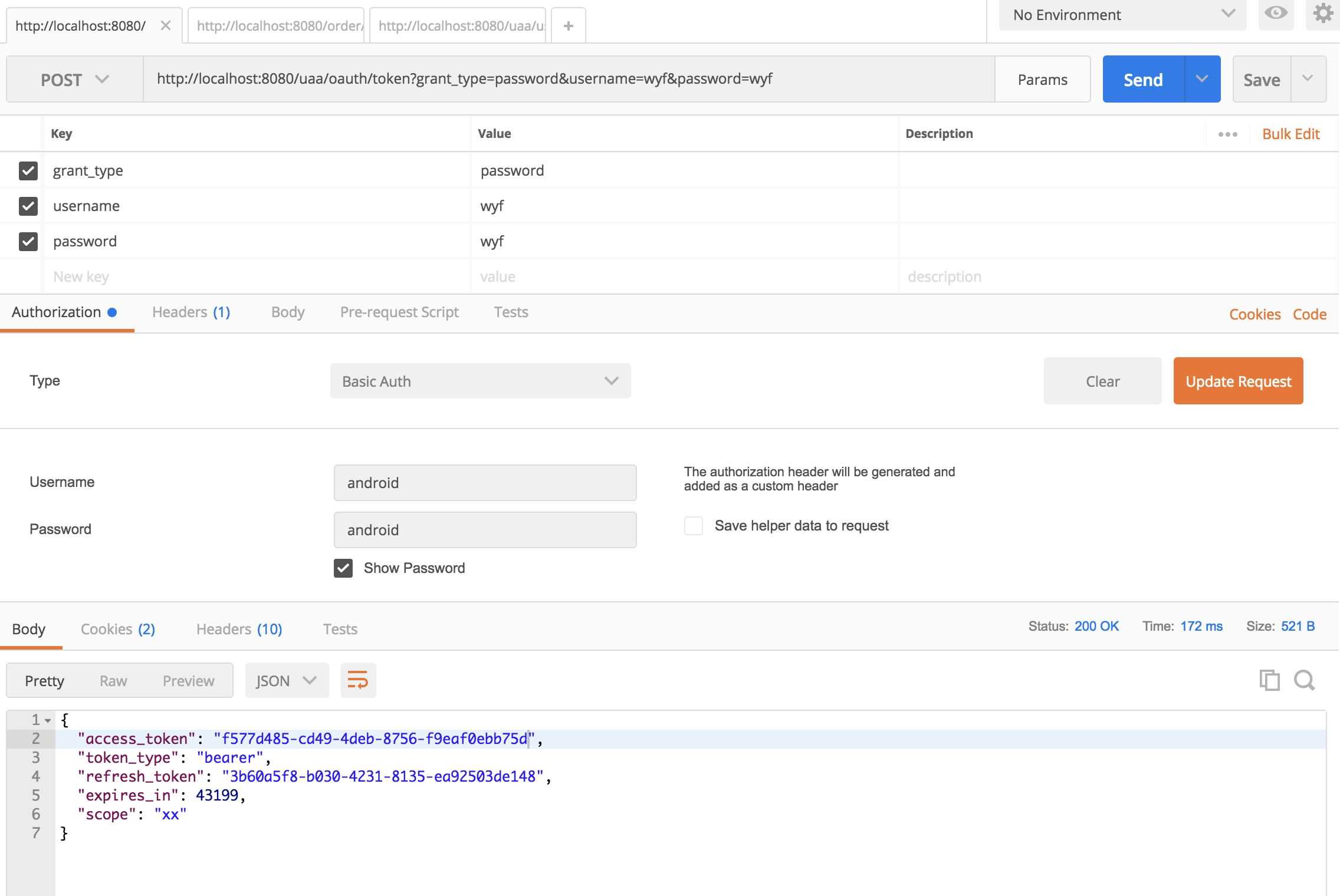 使用Postman向http://localhost:8080/uaa/oauth/token发送请求获得access_token(admin用户的如7f9b54d4-fd25-4a2c-a848-ddf8f119230b)