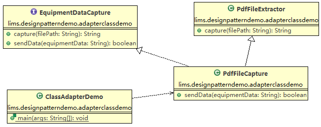 “PDF文件数据采集器”实现时,要实现“仪器数据采集器”接口,实现“采集数据”方法;目前有“PDF文件内容解析工具”类PdfFileExtractor,该类实现PDF文件的数据解析;因此,可使“PDF文件数据采集器”继承“PDF文件内容解析工具”类,并实现“仪器数据采集器”接口,如下图所示:
