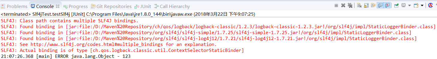 最后做一个测验,我们把所有日志打开,引入logback-classic、slf4j-simple、log4j,运行Test方法,控制台输出为: