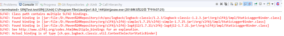 这就是因为有三个"org/slf4j/impl/StaticLoggerBinder.class"存在的原因,此时reportMultipleBindingAmbiguity方法控制台输出语句: