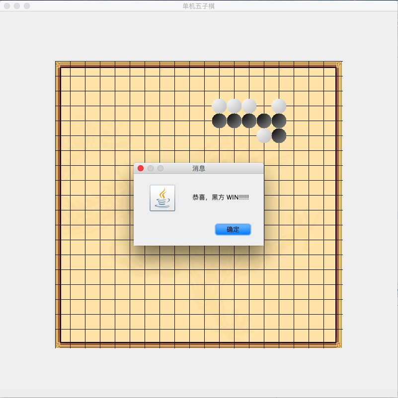 接下来我们要实现的功能是在有五连珠的时候,在屏幕上提示信息。直接在mousePressed函数的isWin部分使用showMessageDialog即可。