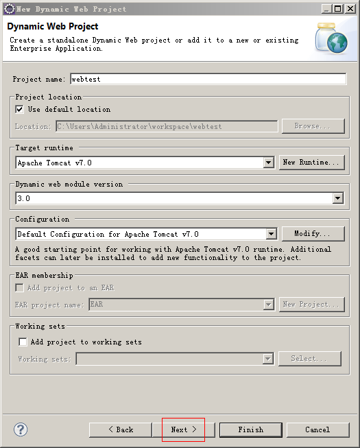 创建项目时,点击Next按钮,不要点击Finish。