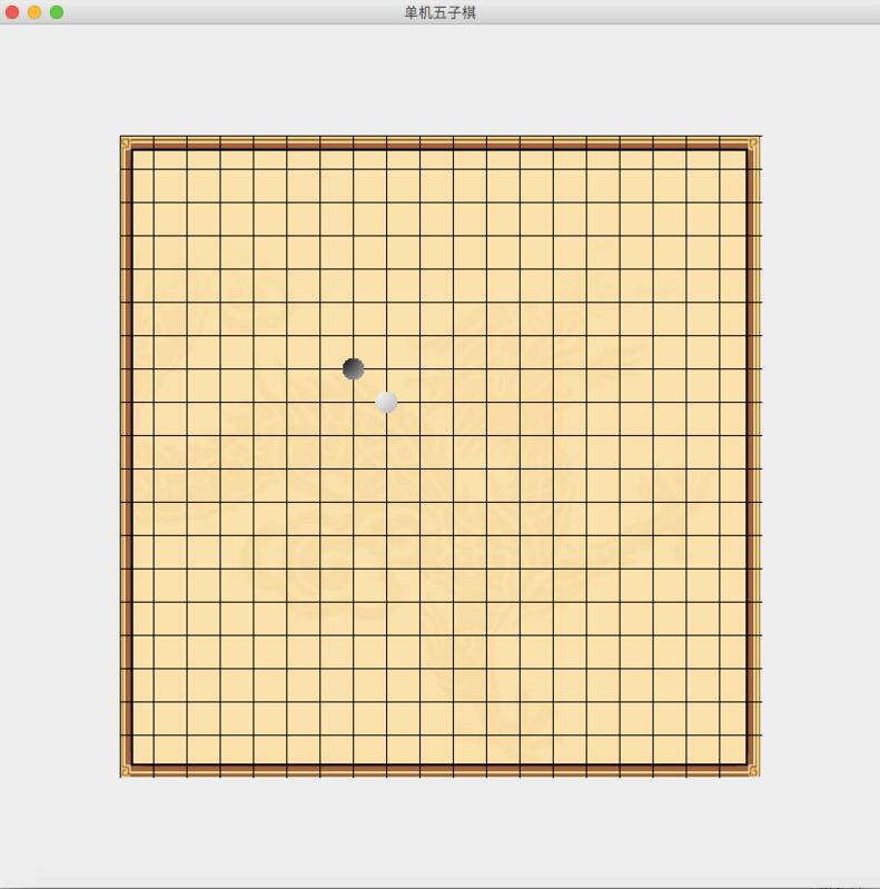 接着我们上一部分的画好棋盘的代码部分,新增画棋子的代码,我用两个棋子(一白一黑,分别位于棋盘的【8,8】,【7,7】)来检验画棋子的代码