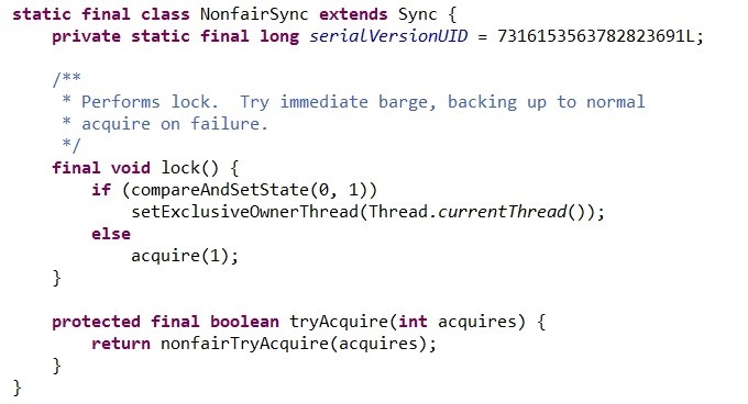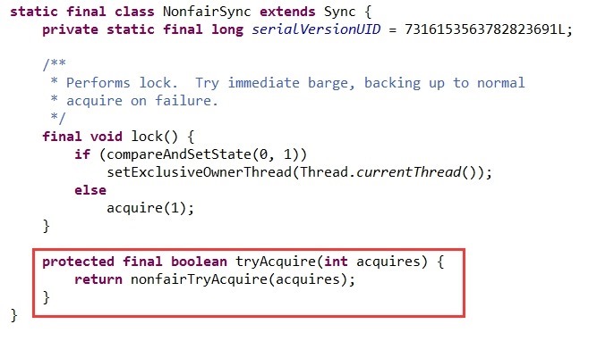 非公平锁的tryAcquire()方法内部调用nonfairTryAcquire方法如下: