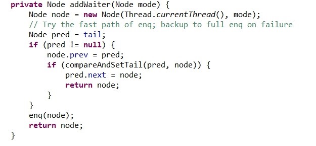 若tryAcquire()方法再次尝试不成功。则首先会调用addWaiter()方法,将当前线程加入等待队列。addWaiter方法返回一个Node节点。