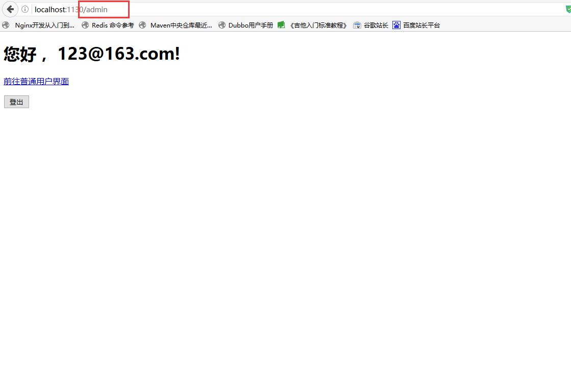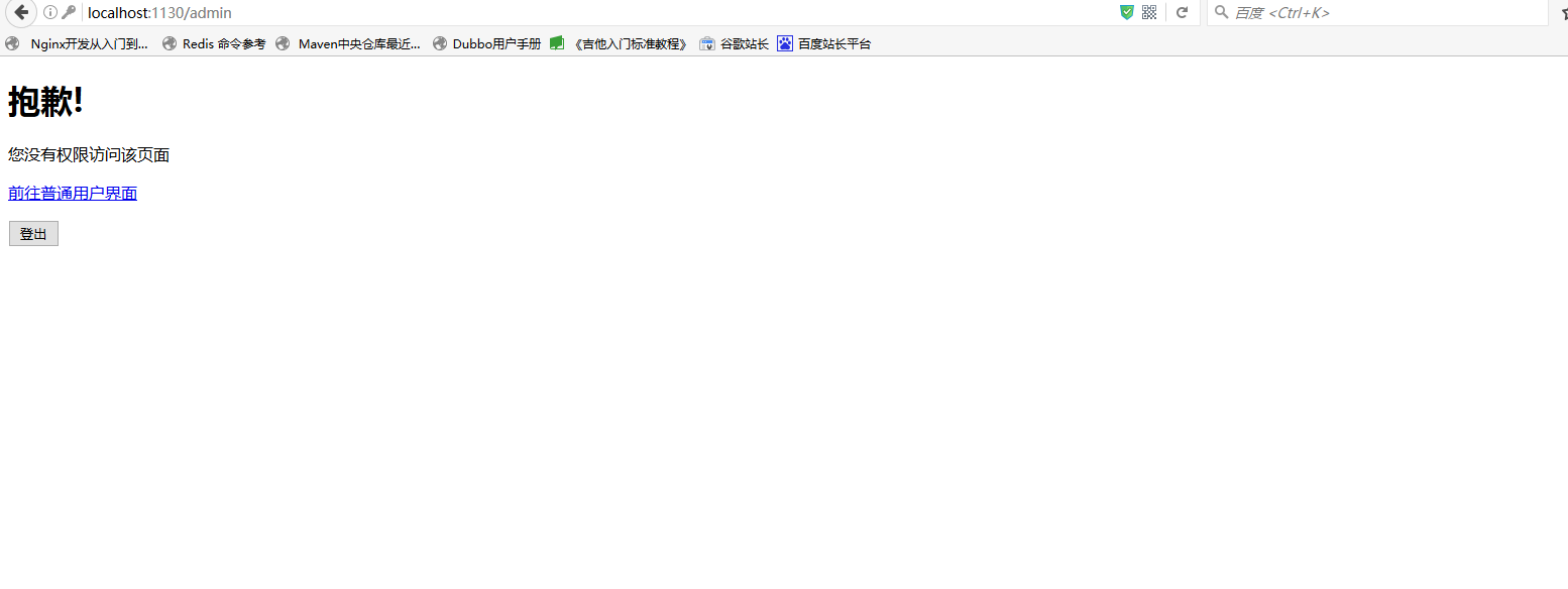 现在我们修改数据库中的用户角色,改为“ROLE_admin”。退出登录后重新登录,再次点击“前往管理员页面”按钮,会跳转到如下页面。