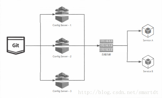 传统模式:不需要为这些服务端做任何额外的配置,只需要遵守一个配置规则,将所有的Config Server都指向同一个Git仓库,这样所有的配置内容就通过统一的共享文件系统来维护。而客户端在指定Config Server位置时,只需要配置Config Server上层的负载均衡设备地址即可, 就如下图所示的结构。