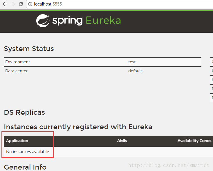 在完成了上面的配置后,启动应用并访问 http://localhost:5555/。可以看到如下图所示的 Eureka 信息面板, 其中 Instances currently registered with Eureka 栏是空的, 说明该注册中心还没有注册任何服务。