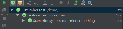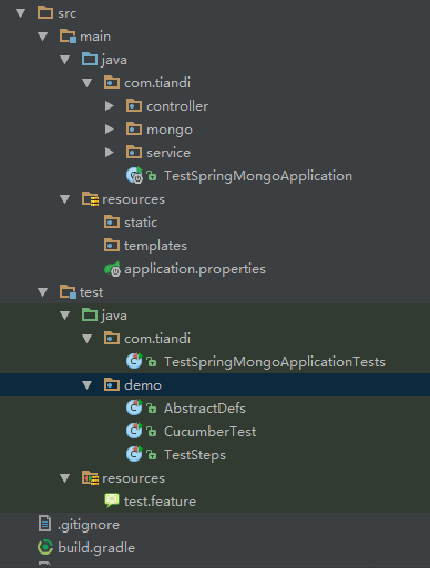 src中为常见的spring代码结构,我们不再具体讲解。test文件夹中上边为自带的SpringBootTest测试框架,而demo中的内容是Cucumber框架的具体配置。