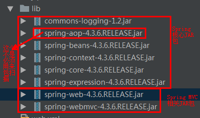 既然是基于Spring那么 Spring的核心jar包(beans,context,core,expression,commons-logging)是必须的;Spring MVC的相关Jar包有个(web,webmvc),特别包(aop)这个包不是必须,但如果基于注解,用以包扫描的时候就必需
