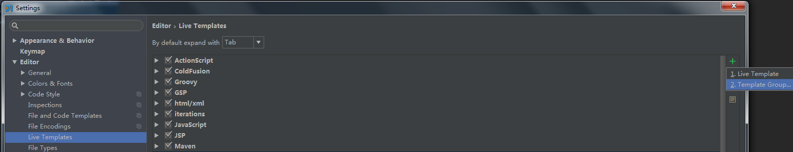 1.还是Settings,搜索Live,可以看到Live Template,点击右边的+号,选择第二项,输入名称,比如MyTemplate