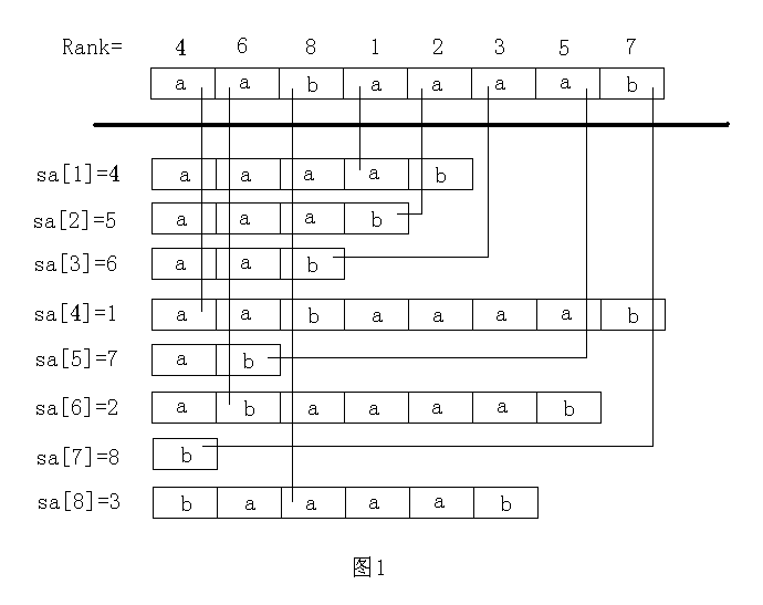 rank: 后缀数组的名次数组 相当于存的是第i个后缀对应的名次是多少 比如rank[0]就是指"aabaaaab"这个后缀的名次 rank[1]指"abaaaab"这个后缀的名次