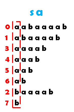 public int[] sa;// 满足Suffix[SA[1]] < Suffix[SA[2]] …… < Suffix[SA[Len]],即排名为i的后缀为Suffix[SA[i]]