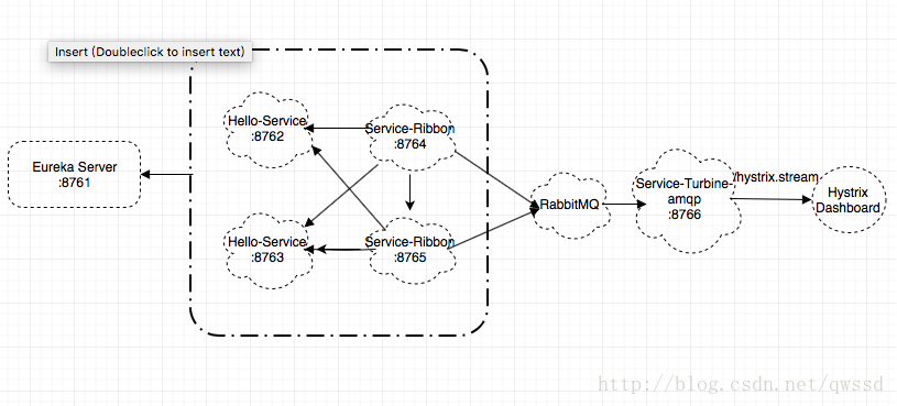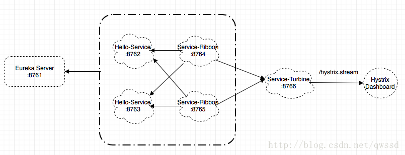 本文的工程实现是基于上一篇文章的工程,通过引入Turbine来聚合service-ribbon服务的监控信息,并输出给Hystrix Dashboard来进行展示。因为我们需要多个服务的Dashboard,所以我们将构建service-ribbon集群,同时需要新建一个service-turbine工程,用于聚合信息并展示。最终整体架构如下: