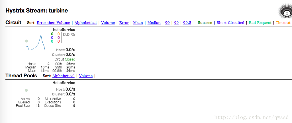访问http://localhost:8765/hystrix,输入监控流http://localhost:8766/turbine.stream看到: