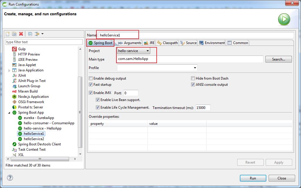 以上是hello-service1的启动步骤,端口号为9090;同样方法设置hello-service2,端口号为9091(具体实现略)。