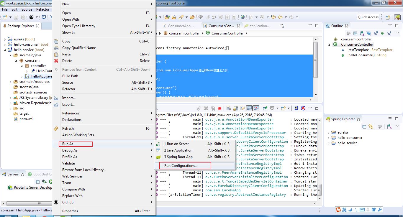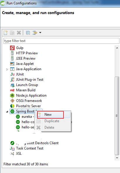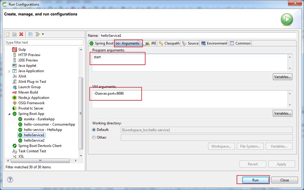 6.启动,测试1.)启动eureka。为了展示负责均衡的效果,我们的hello-service启动两个服务,启动两个服务的具体步骤如下