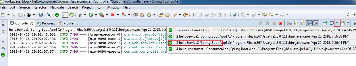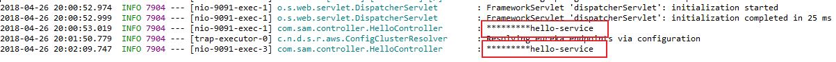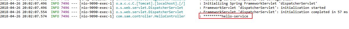 4.) 多次访问http://localhost:9999/hello-consumer,会发现hello-service1和hello-service2会轮流被调用(已经实现了负责均衡),可以通过两者的控制台打印内容确认(还记得我们在hello-service的controller中有个loggerlogger.info("*********" + instance.getServiceId());吗?对,就是这个打印)