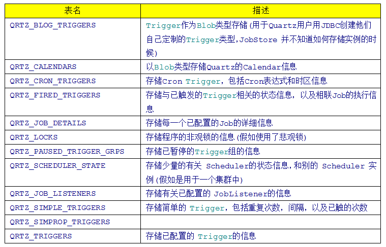 因为Quartz集群依赖于数据库,所以必须首先创建Quartz数据库表,Quartz发布包中包括了所有被支持的数据库平台的SQL脚本。这些SQL脚本存放于<quartz_home>/docs/dbTables 目录下。这里采用的Quartz 1.8.4版本,总共12张表,不同版本,表个数可能不同。数据库为mysql,用tables_mysql.sql创建数据库表。全部表如图2.2所示,对这些表的简要介绍如图2.3所示。