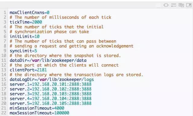ZooKeeper 配置很简单,每个节点的配置文件(zoo.cfg)都是一样的,只有 myid 文件不一样。myid 的值必须是 zoo.cfg中server.{数值} 的{数值}部分。