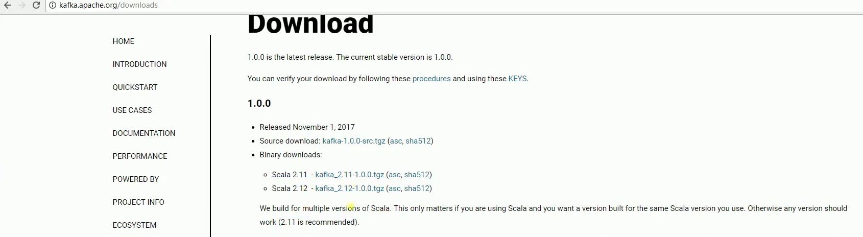我们工程准备好了,暂时先放在这里,下面进行Kafka的安装下载,首先我们去Kafka官网kafka.apache.org/downloads 下来官网推荐的版本,
