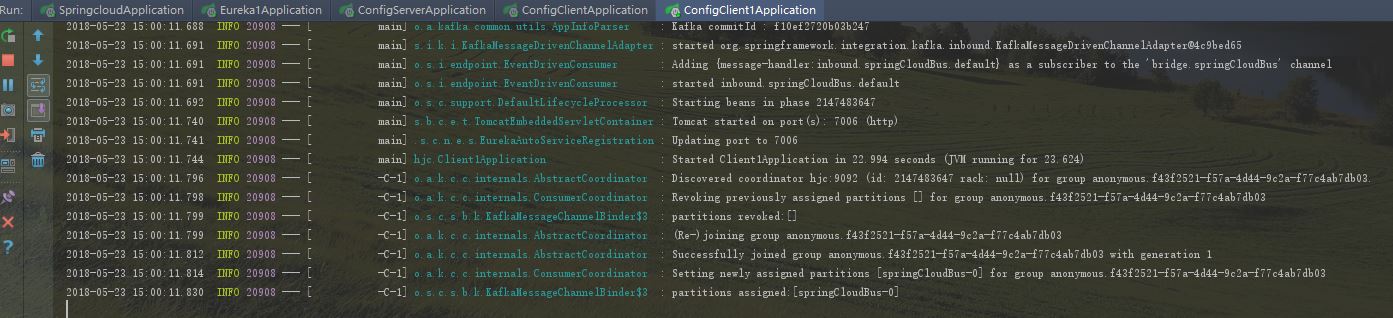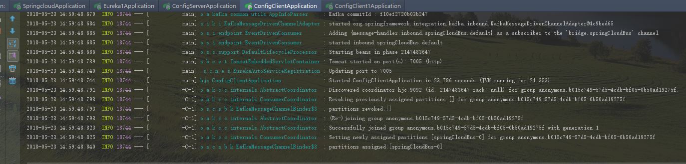 可以看到springcloudBus是在0分片上,如果两个config-client启动都出现上面信息,证明启动成功了。