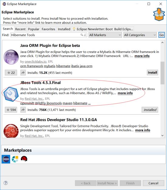 打开eclipse,点击help-->eclipse marketplace,如图输入:Hibernate Tools,再点击Goa按钮,找到JBoss Tools