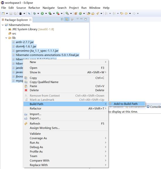 1.创建新项目hibernateDemo,在工程下建立lib文件夹。打开jar包的目录,导入lib/required下的和数据库的jar包,add to build path