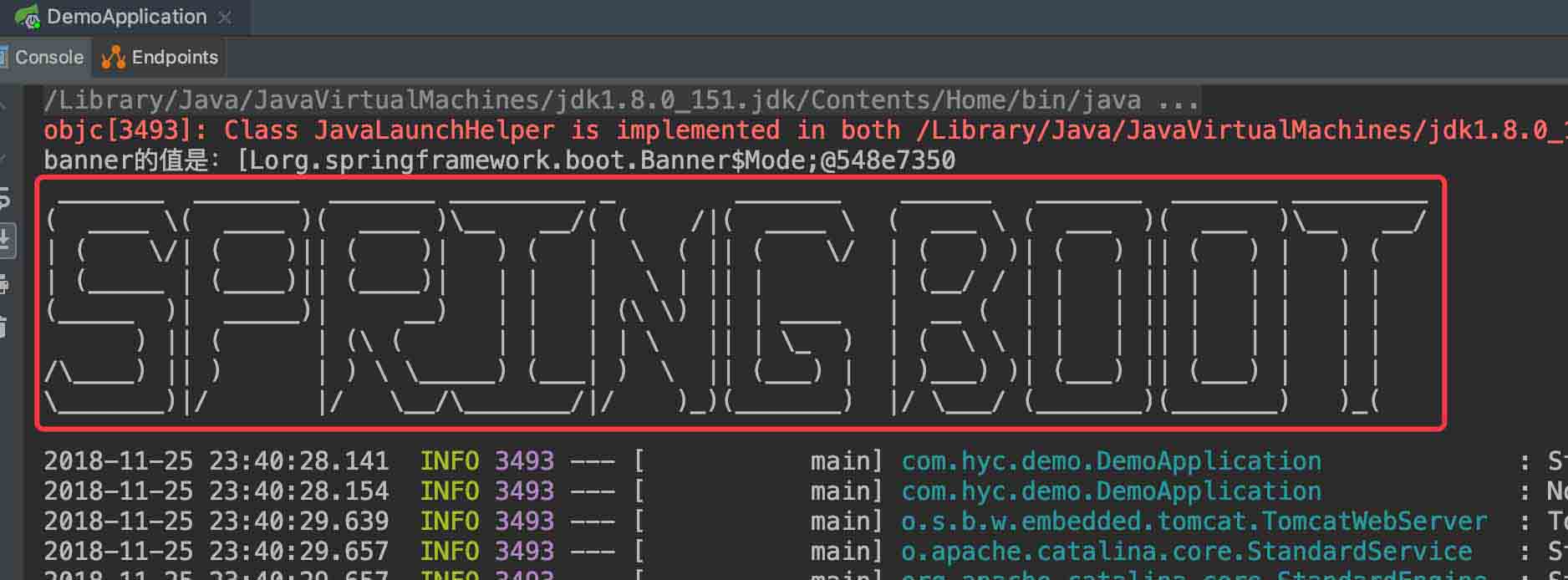 上面红色框框内的“SPRING BOOT”被称为Banner,意为横幅,默认会开启并在控制台打印,其实我们可以修改它的内容和样式,即定制;并选择是否开启及开启后将其输出到哪里。