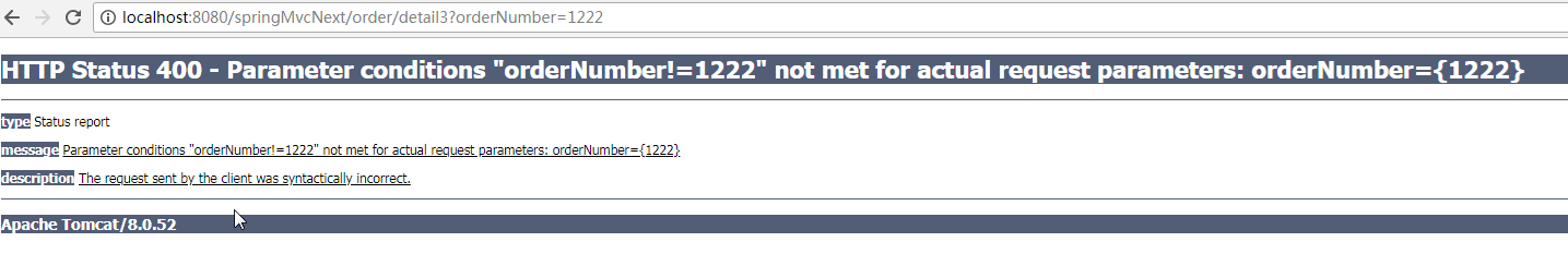 示例6限定请求参数必须包含参数orderNumber并且参数值不能为1222 访问路径:http://localhost:8080/springMvcNext/order/detail3?orderNumber=1222 时报错