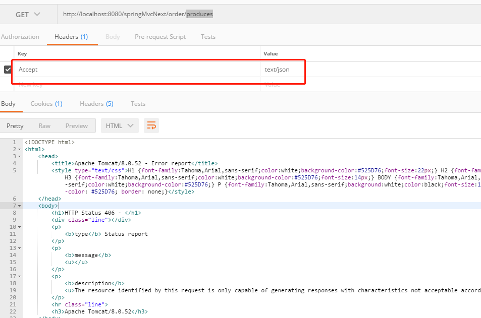 示例8 表示返回内容格式application/json ,当客户端设置的accept格式为text/json时,运行报错,Http status 406