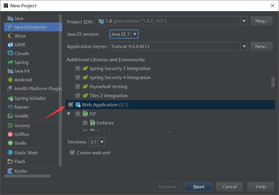 2.由于这里我们仅仅为了展示如何成功部署Tomcat,以及配置完成后成功运行一个jsp文件,我仅勾选JavaEnterprise-->Web Application-->Next。可能由于我之前配置过了所以在Application Server这一栏会显示已有Tomcat,你们忽略就好。