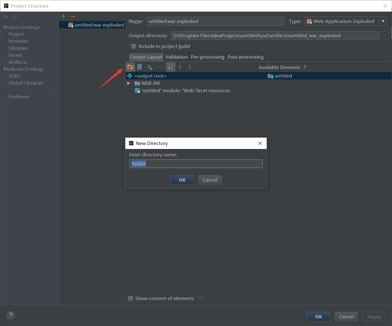 新建文件夹-->绿色小加号-->Directory Content选择Web存放的位置,当然是Tomcat的webapps了,生成的war文件部署在该项目中才可以在Tomcat服务器上运行。直接运行在web文件夹下的index。jsp文件,做最后验证。