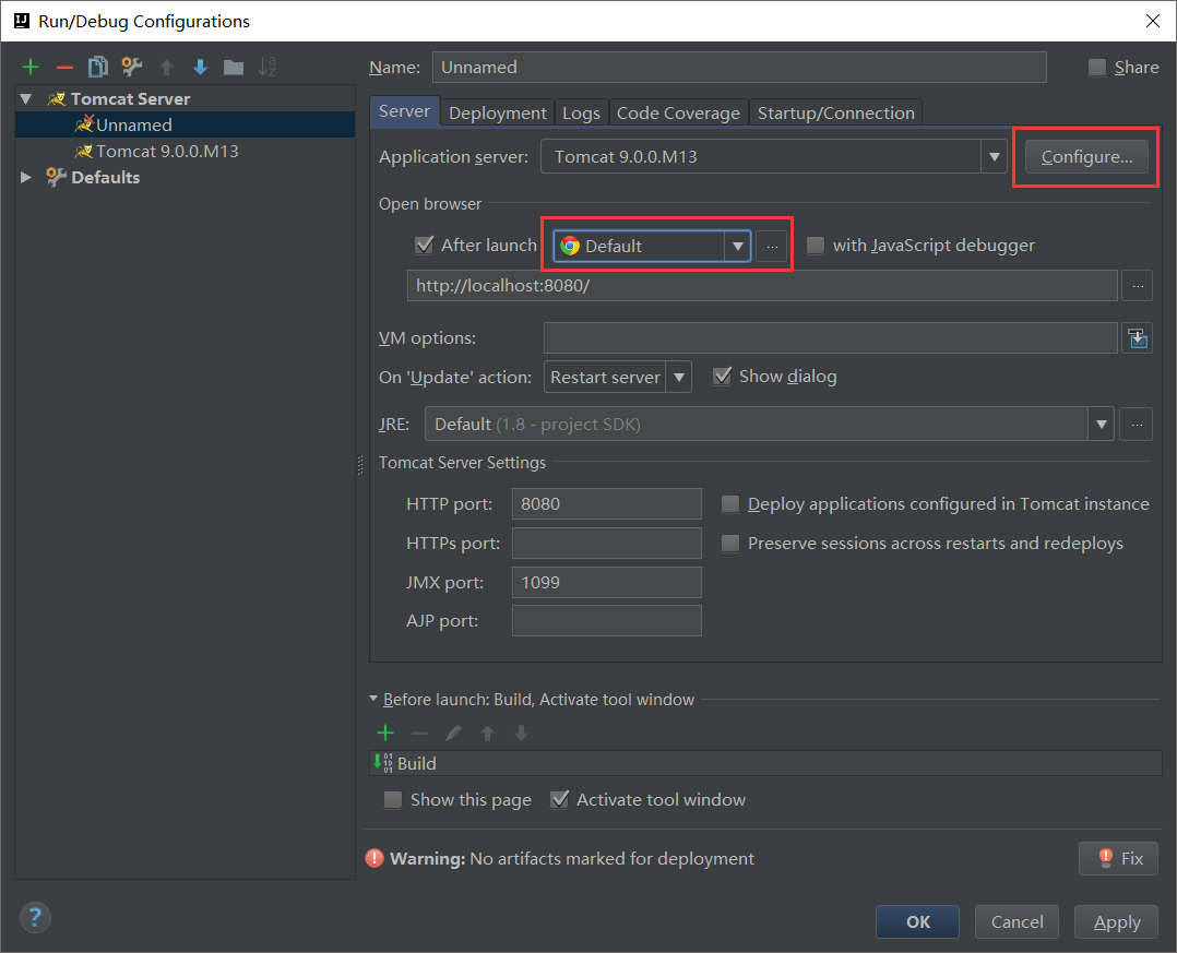 点击"Configure...",配置Apache你从官网上下载的Tomcat,zip压缩包解压后的文件目录 ,我的是apache-tomcat-9.0.0.M13。而且我没有进行配置,是IDE自己定位好的,很智能,我当时有小惊奇哈哈。