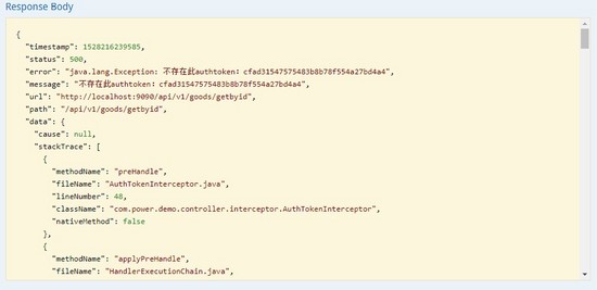 启动应用后,调用接口就可以看到拦截器拦截的效果了。全局统一的异常管理 GlobalExceptionHandler 捕获异常后处理如下: