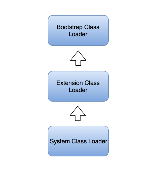 三个类加载器之间通过这个层次关系协同工作,一起负责类的加载工作。上面的这种层次模型称为类加载器的“双亲委派”模型。双亲委派模型要求,除了最顶层的Bootstrap类加载器之外,所有的类加载器都必须有一个parent加载器。当类加载器加载类的时候,首先检查缓存中是否有已经被加载的类。如果没有,则优先委托它的父加载器去加载这个类,父加载器执行和前面子加载器一样的工作,直到请求达到顶层的Bootstrap类加载器。如果父加载器不能加载需要的类,那么这个时候才会让子加载器自己去尝试加载这个类。工作原理类似于下面这种方式: