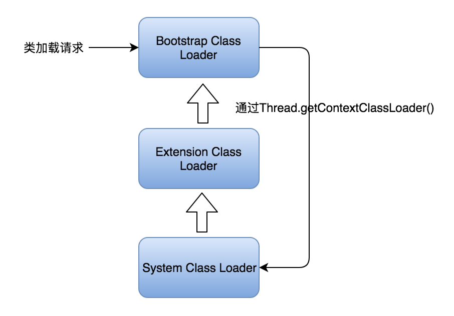 为了解决这个问题,引入了线程上下文类加载器。通过java.lang.Thread类的setContextClassLoader()设置当前线程的上下文类加载器(如果没有设置,默认会从父线程中继承,如果程序没有设置过,则默认是System类加载器)。有了线程上下文类加载器,应用程序就可以通过java.lang.Thread.setContextClassLoader()将应用程序使用的类加载器传递给使用更顶层类加载器的代码。比如上面的JNDI服务,就可以利用这种方式获取到可以加载SPI实现的类加载器,获取需要的SPI实现类。