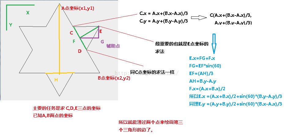 首先来思考这个程序怎么写,当 count = 0 时就应该是一个三角形,这三个点是你一开始就确定的,以后的改变都依据这三个点发展的。当不是0的时候就需要计算相对于这个三角形的9个点,分别是每条边上的两个点,和它对应的三角形第三个顶点。