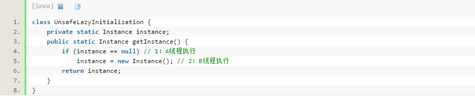 A线程执行1后,发现对象instance为null,准备对其new,而B线程却先new了,这造成了错误