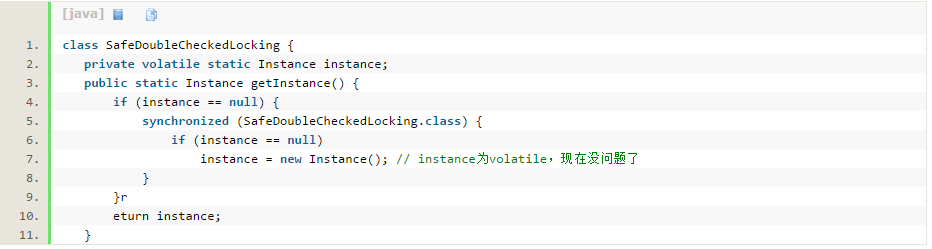 我们会发现基于类初始化的方案的实现代码更简洁。但基于volatile的双重检查锁定的方案有一个额外的优势:除了可以对静态字段实现延迟初始化外,还可以对实例字段实现延迟初始化。字段延迟初始化降低了初始化类或创建实例的开 销,但增加了访问被延迟初始化的字段的开销。在大多数时候,正常的初始化要优于延迟初始化。如果确实需要对实例字段使用线程安全的延迟初始化,请使用上面介绍的基于volatile的延迟初始化的方案;如果确实需要对静态字段使用线程安全的延迟初始化,请使用上面介绍的基于类初始化的方案。