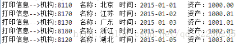 System.out.println("打印信息-->机构:"+vo.getCode()+" 名称:"+vo.getName()+" 时间:"+vo.getDate()+" 资产:"+vo.getMoney());